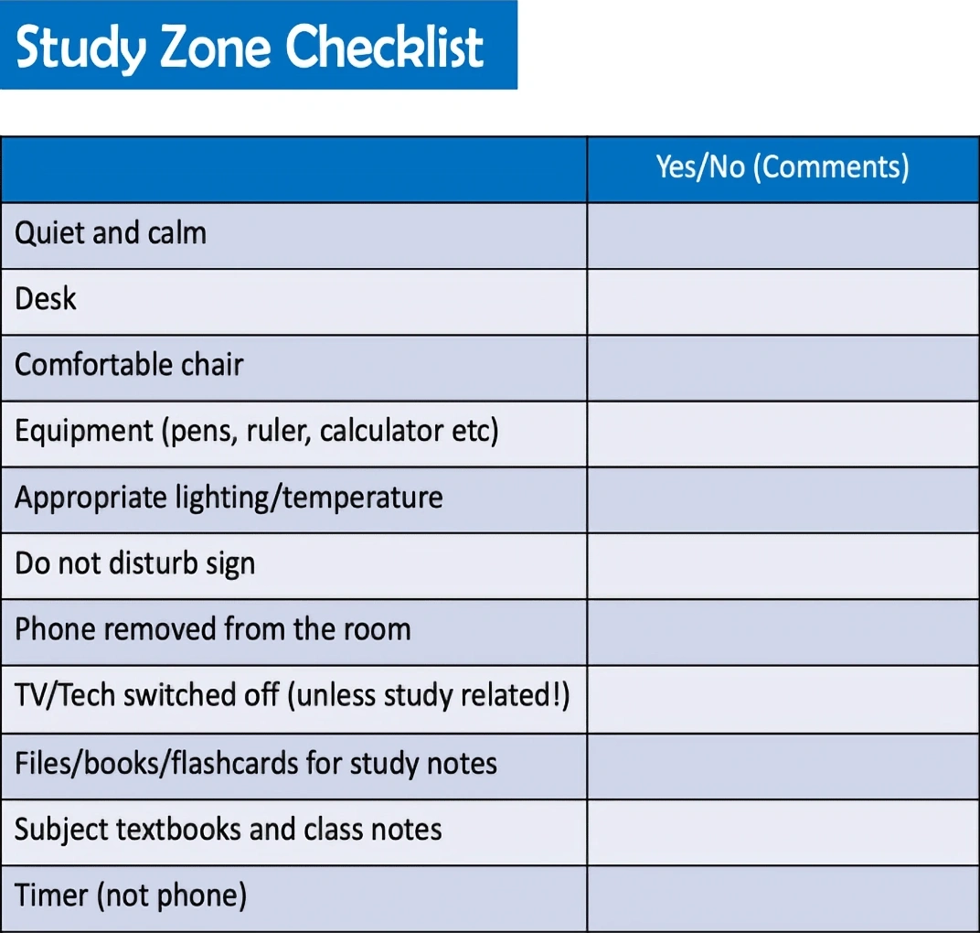 First is a Study Zone checklist which can be used to assess the suitability of a study space. After completing this, a student might conclude that a different space is needed.